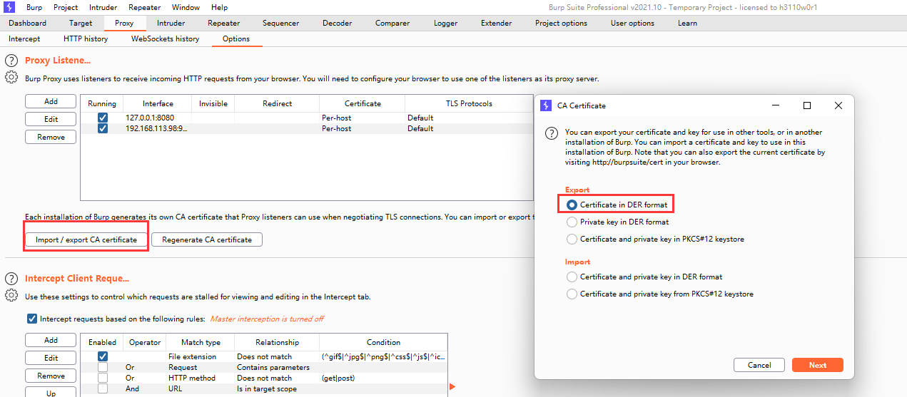 在Burpsuite中导出证书,如果前面的步骤中手机没有浏览器,可以直接在Burpsuite中导出证书,然后adb push到手机上。