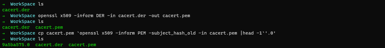 修改证书格式,并adb push到手机系统证书安装目录(/system/etc/security/cacerts)(openssl可以使用windows子系统wsl中的命令):