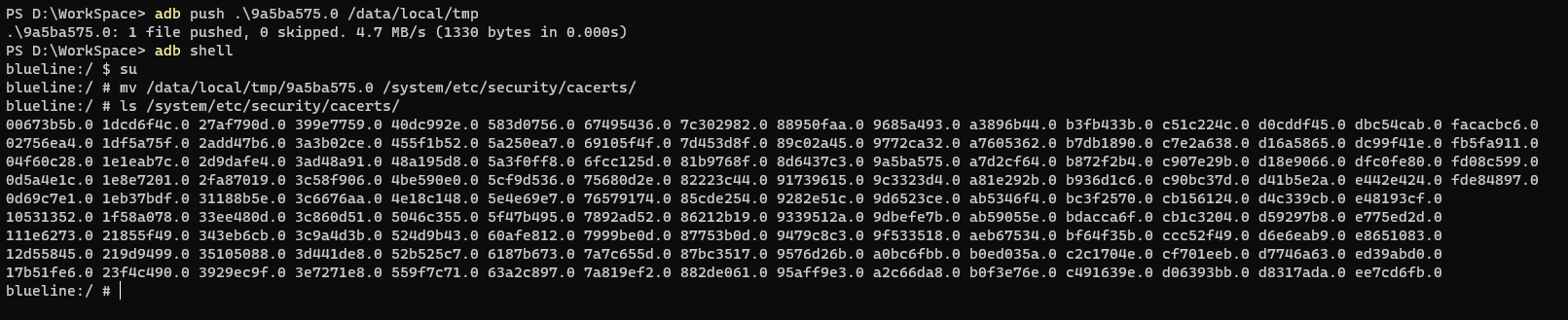其中向/system/etc/security/cacerts写入文件时需要先执行 adb root & adb remount ,因为/system/etc/security/cacerts默认是只读的。如果执行有问题,可以参考笔者博客的《Notes》部分。