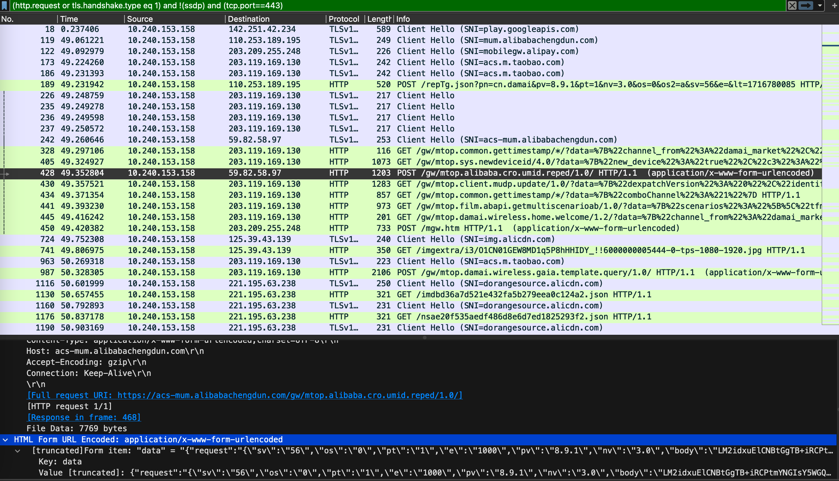 再次执行wireshark过滤条件,wireshark能解析https流量: